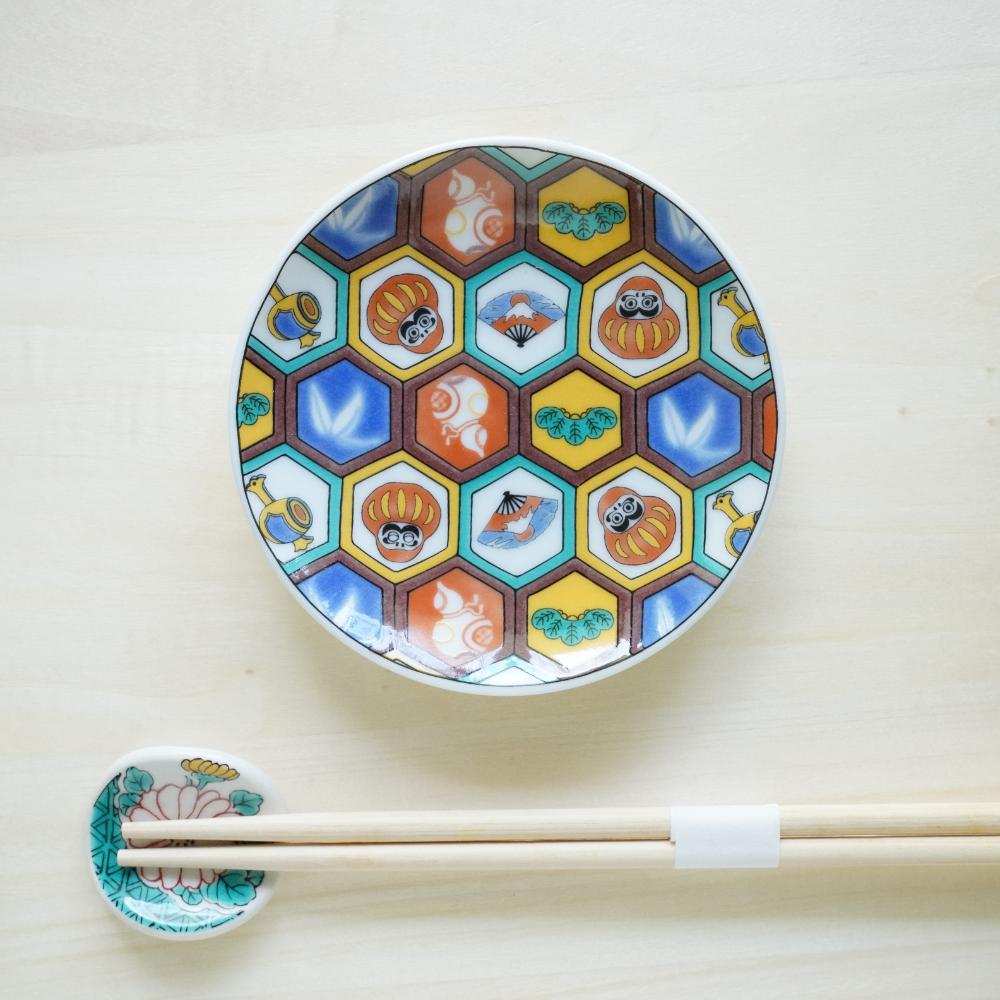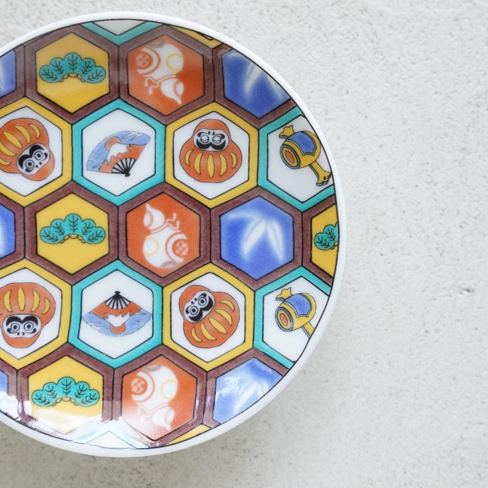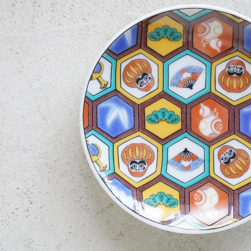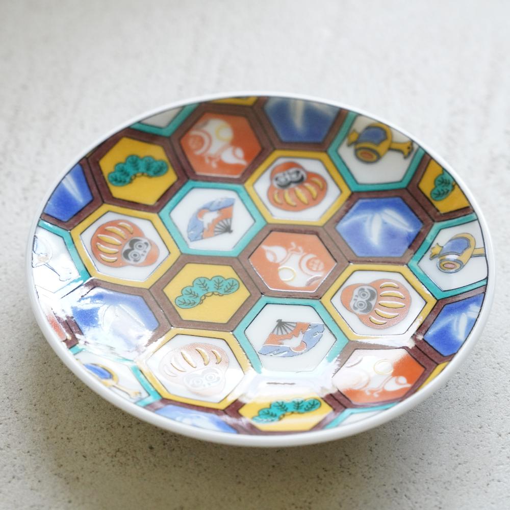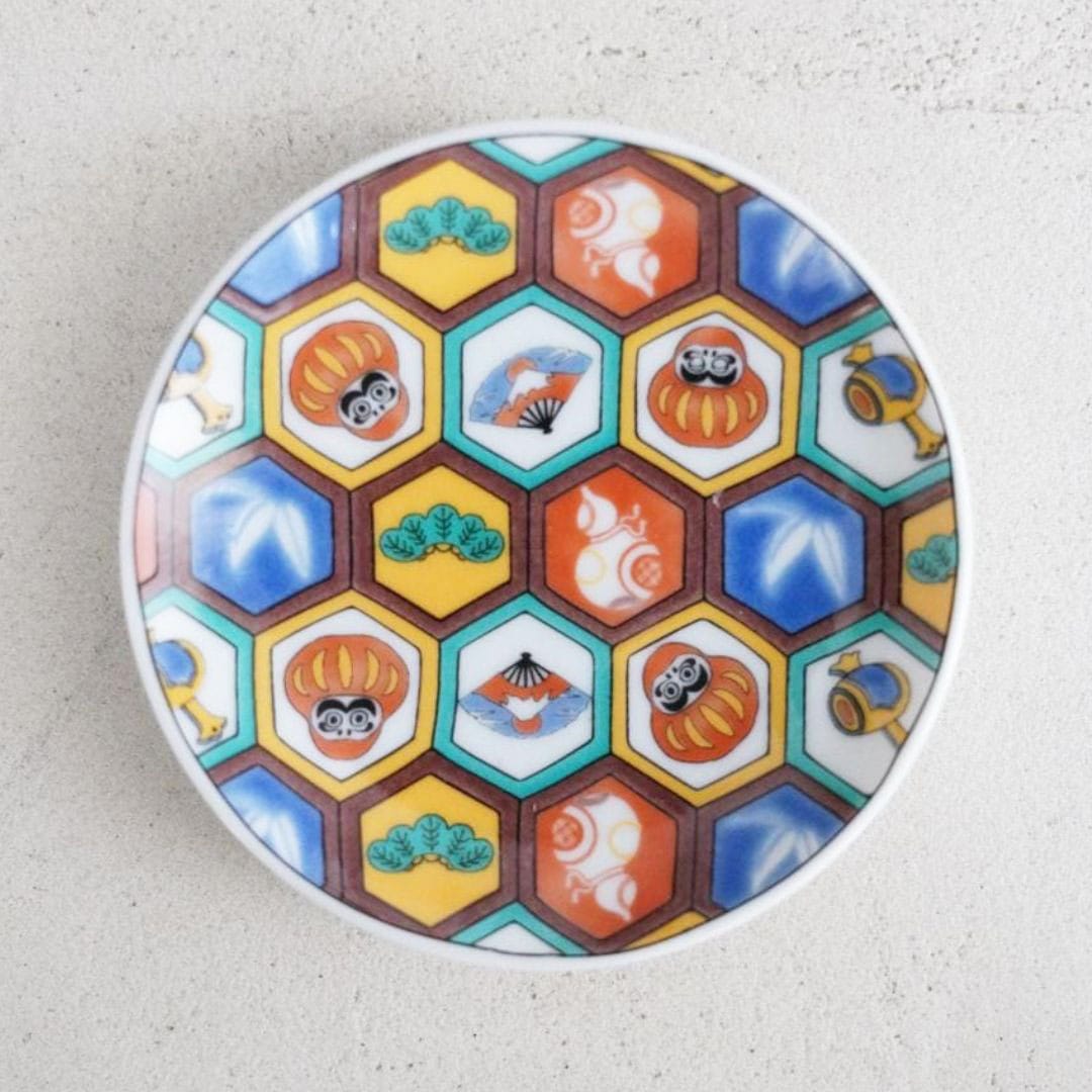 A Kutani mini plate with a Daruma motif, adding luck and brightness to any table setting.