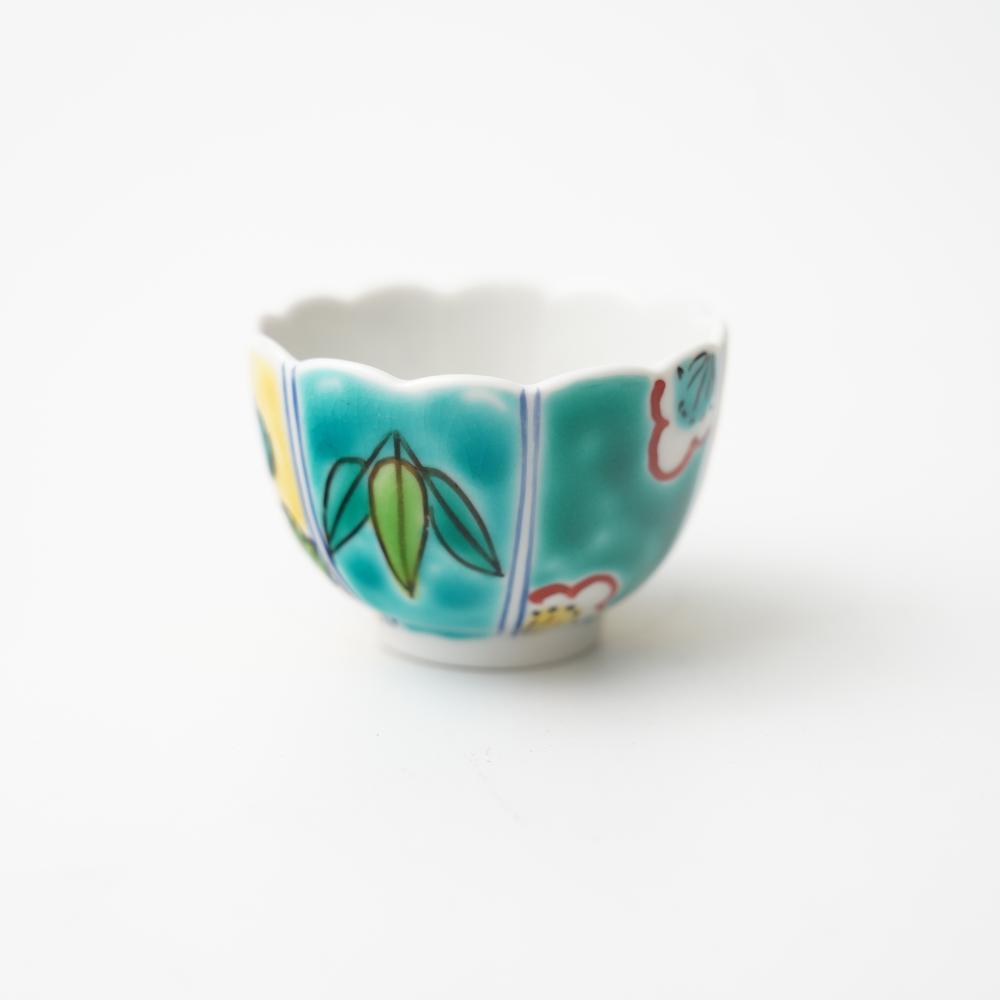 A delicate, flower-like shape adorned with the colorful pine, bamboo, and plum motif.