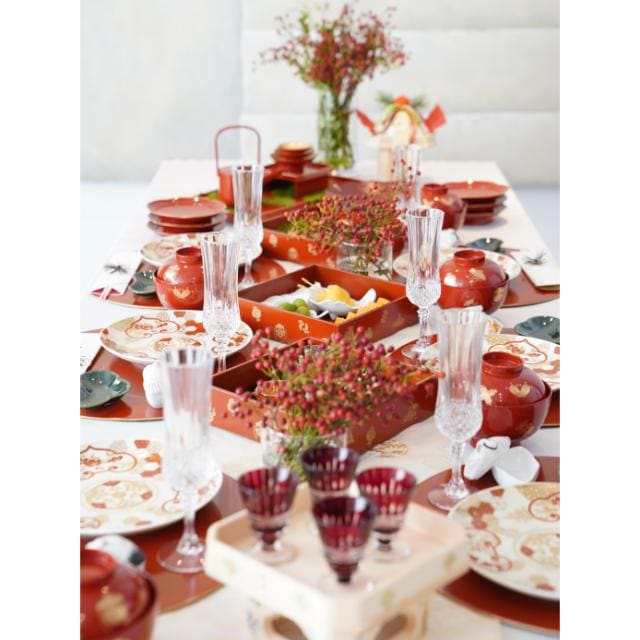 A beautifully crafted half-moon tray in a rich persimmon red, perfectly suited to a Japanese-style setting. The rim is accented with gold, adding a touch of sophistication.